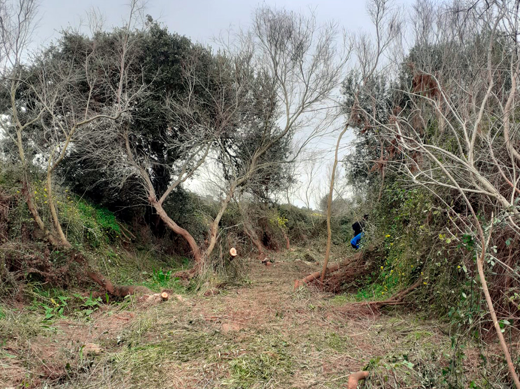 Wenn diese Bäche durch ungeeignete Vegetation oder invasive Pflanzen verstopft oder stark degradiert sind, können gravierende Probleme auftreten: Überflutungen bei Starkregen, Schäden an Infrastrukturen wie dem Camí de Cavalls sowie der Verlust natürlicher Werte. Die von uns durchgeführten Maßnahmen setzen genau hier an.